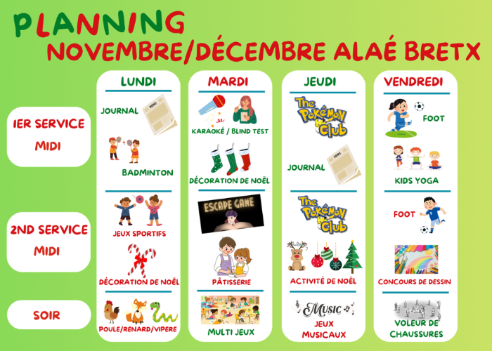 Au programme de l'ALAE de Bretx pour la deuxième période : sport, ateliers manuels, yoga, karaoké, création d’un journal et préparation des fêtes de fin d'année … Les enfants explorent, s’expriment et s’amusent dans une ambiance conviviale et créative.