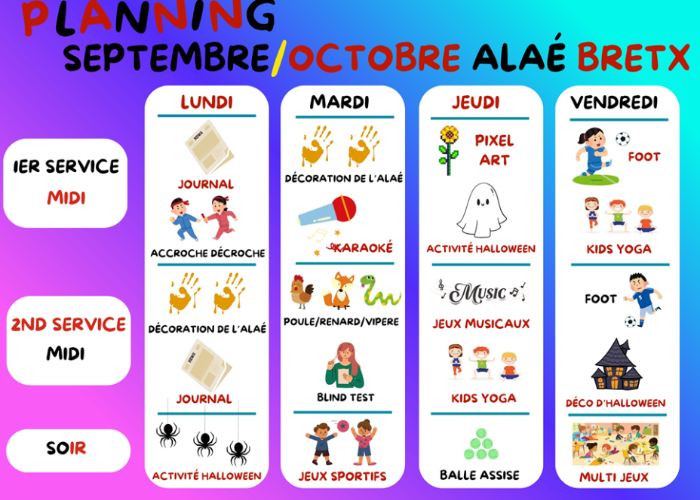Au programme de l'ALAE de Bretx pour la première période : sport, ateliers manuels, yoga, karaoké, création d’un journal et préparation d’Halloween… Les enfants explorent, s’expriment et s’amusent dans une ambiance conviviale et créative.